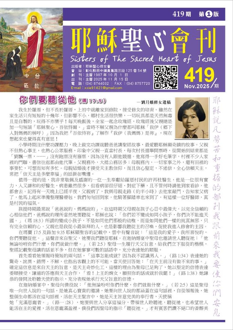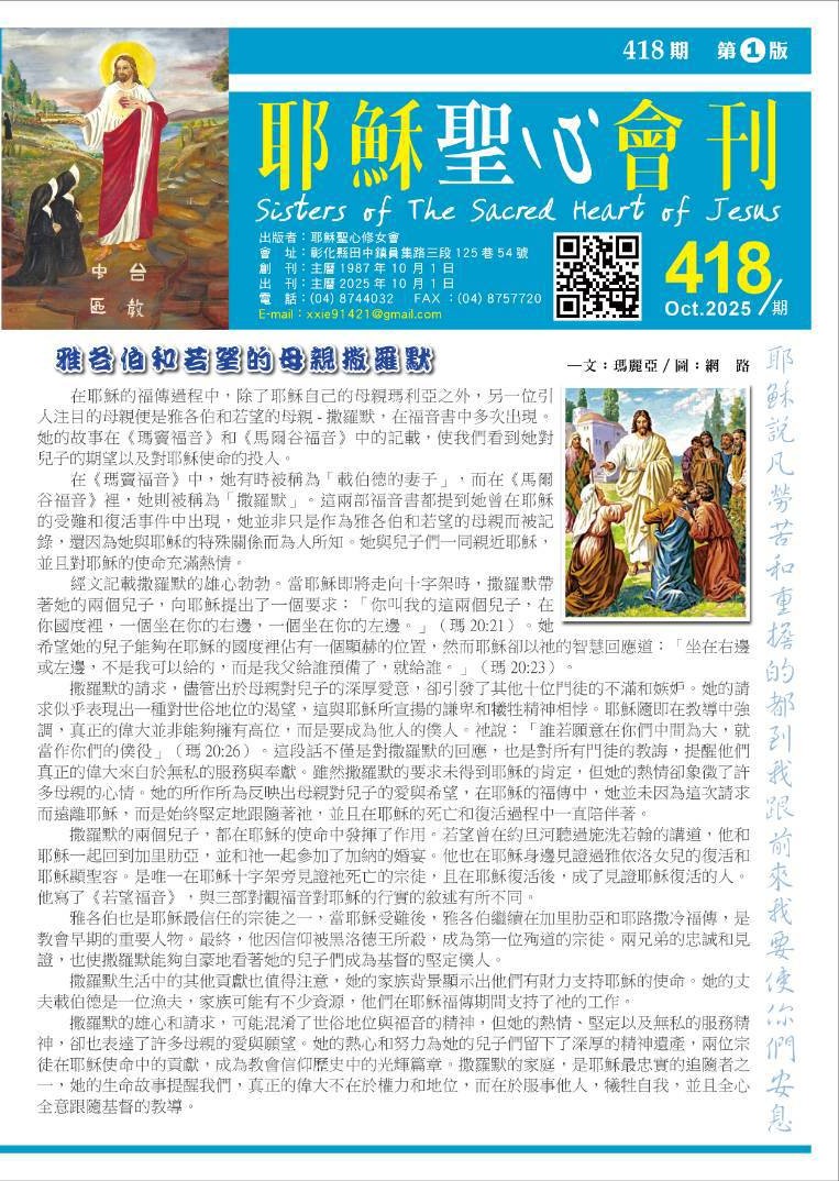耶穌聖心會是台灣最先成立的修女會,由美國瑪利諾會蔡文興主教於1952年,在彰化縣田中鎮所成立的;是台中教區傳教工作的生力軍,目前約有60位修女,包括台灣、菲律賓、越南三個地方,姊妹們同心合意為堂區、學校、社會服務以光榮天主。每天的靈修(彌撒、日課、祈禱等)是我們工作的後盾,團體生活是我們放鬆與共融的好時機。